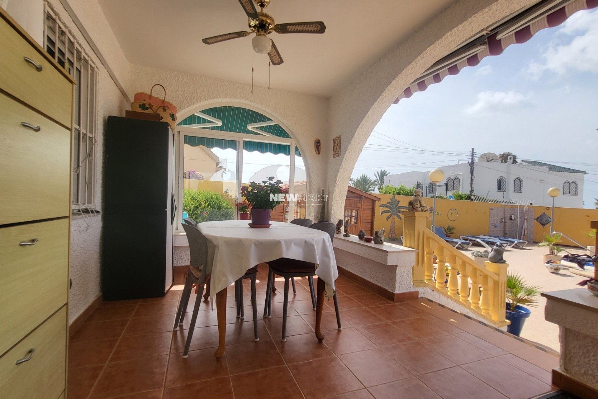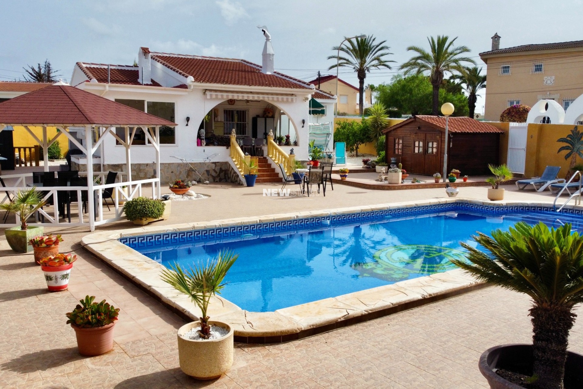 Der Außenbereich der Immobilie ist ebenso beeindruckend mit einem gepflegten privaten Pool von 10 x 5 Metern mit römischen Stufen, Poolbeleuchtung und Außendusche. Die umliegende Sonnenterrasse ist komplett gefliest und pflegeleicht und bietet reichlich Platz zum Entspannen und Sonnenbaden. Ein hübsches Pavillon bietet einen überdachten Essbereich neben einem eingebauten Grill, ideal für Unterhaltung von Familie und Freunden. Der Garten umfasst auch einen großen Holzschuppen sowie einen maßgeschneiderten Abstellraum/Werkstatt. Vor dem Grundstück finden Sie eine private Einfahrt mit automatischen Toren und einen Carport, der Schattenparkplätze bietet. Diese Immobilie kombiniert großzügiges Wohnen im Innenbereich mit außergewöhnlichen Außenbereichen und ist damit ideal für dauerhaftes Wohnen oder Urlaub unter der mediterranen Sonne.
