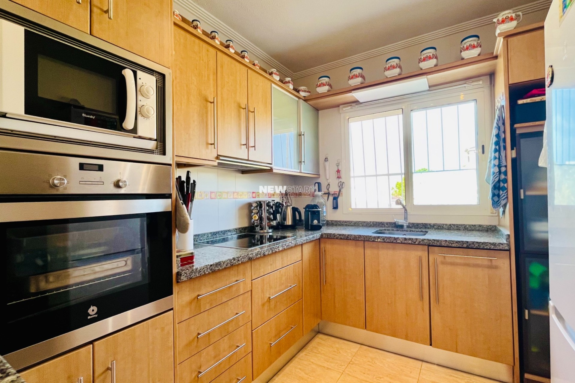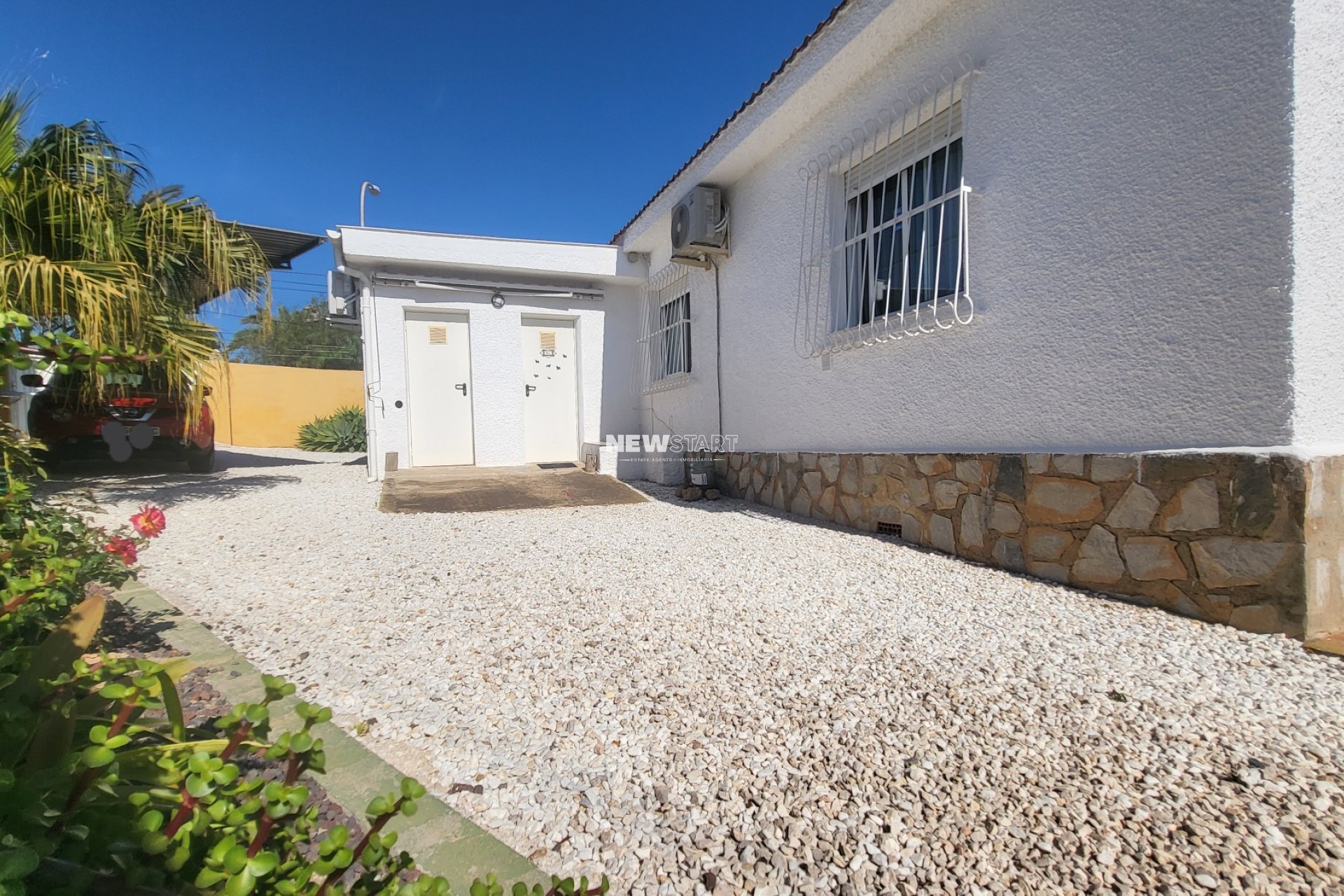 Das Haus ist für bequemes Wohnen auf einer Ebene konzipiert und beginnt mit einigen Stufen zu einer erhöhten überdachten Terrasse. Dieser Bereich ist für das Leben im Freien gestaltet und bietet einen Bereich zum Entspannen sowie zum Essen im Freien mit Blick auf den Garten und den Pool. Im Inneren werden Sie von einem komfortablen, geräumigen Wohnzimmer mit einem Pelletofen begrüßt, ideal für die Wintermonate. Es öffnet sich zu einem außergewöhnlich großen Essbereich, ergänzt durch eine voll ausgestattete amerikanische Küche mit viel Schrankfläche und Granitarbeitsplatten sowie modernen Geräten. Dieser Bereich bildet das Herz des Hauses; von hier aus gelangen Sie zu den Schlafzimmern und einem neu renovierten Familienbadezimmer mit bodengleicher Dusche, Waschbecken und Toilette. Darüber hinaus verfügt die Immobilie über einen separaten Anbau mit einem Studio-Schlafzimmer neben dem Haupthaus sowie ein zweites Badezimmer, ideal für Gäste.