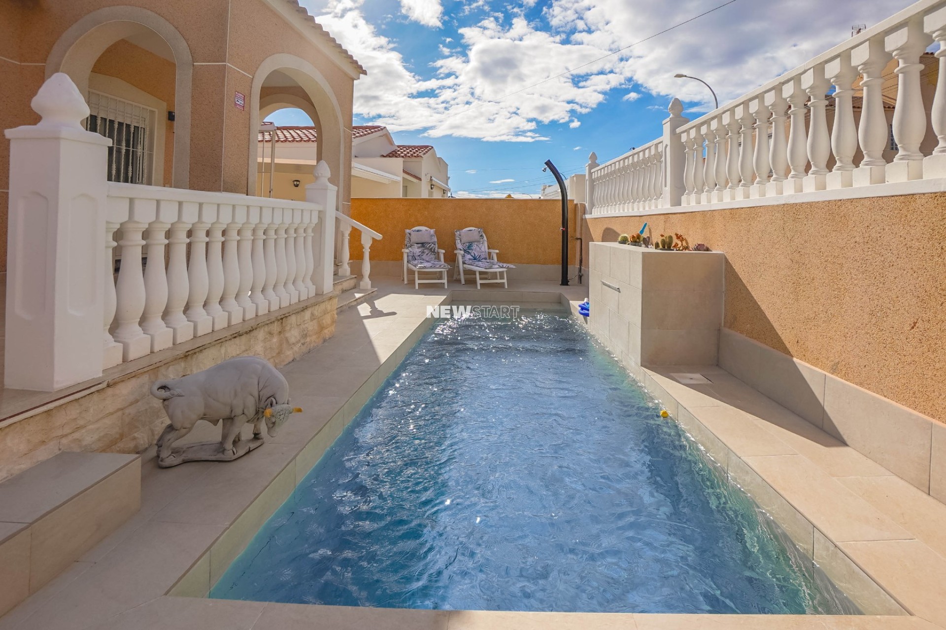 Der pflegeleichte Garten ist vollständig gefliest und gepflastert, einschließlich des Bereichs unter der oberen Terrasse, ideal für überdachtes Essen im Freien sowie einen maßgefertigten gemauerten Grillbereich mit viel Platz zum Sitzen und Unterhalten. Da die Villa auf zwei Ebenen gebaut ist, gibt es auf beiden Seiten Treppen für einen einfachen Zugang. An der Vorderseite befindet sich eine Einfahrt mit gesichertem Stellplatz und als besonderes Highlight eine neu hinzugefügte, gepflegte private Swimmingpoolanlage mit den Maßen 5 x 2, Wasserfall, Pooltreppe und Unterwasserbeleuchtung.