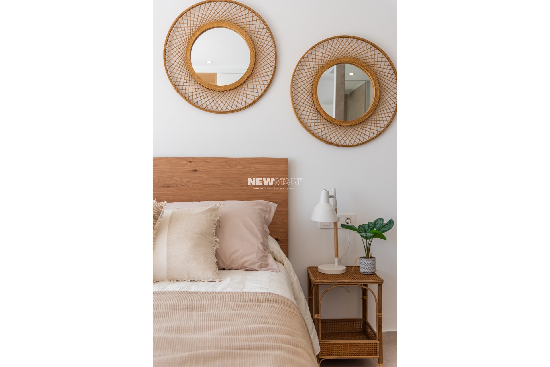El interior de las viviendas está cuidadosamente diseñado para ofrecer comodidad y estilo. Los suelos de cerámica aportan un toque moderno y son fáciles de mantener. Las propiedades cuentan con 3 dormitorios y la opción de 2 o 3 baños, adaptándose a diferentes necesidades familiares. Los armarios empotrados optimizan el espacio de almacenamiento, mientras que las persianas eléctricas y la preinstalación de aire acondicionado aseguran un ambiente confortable en cualquier época del año. La cocina está equipada con electrodomésticos, facilitando el día a día. Además, el solárium opcional ofrece un espacio adicional para personalizar según las preferencias de cada residente.