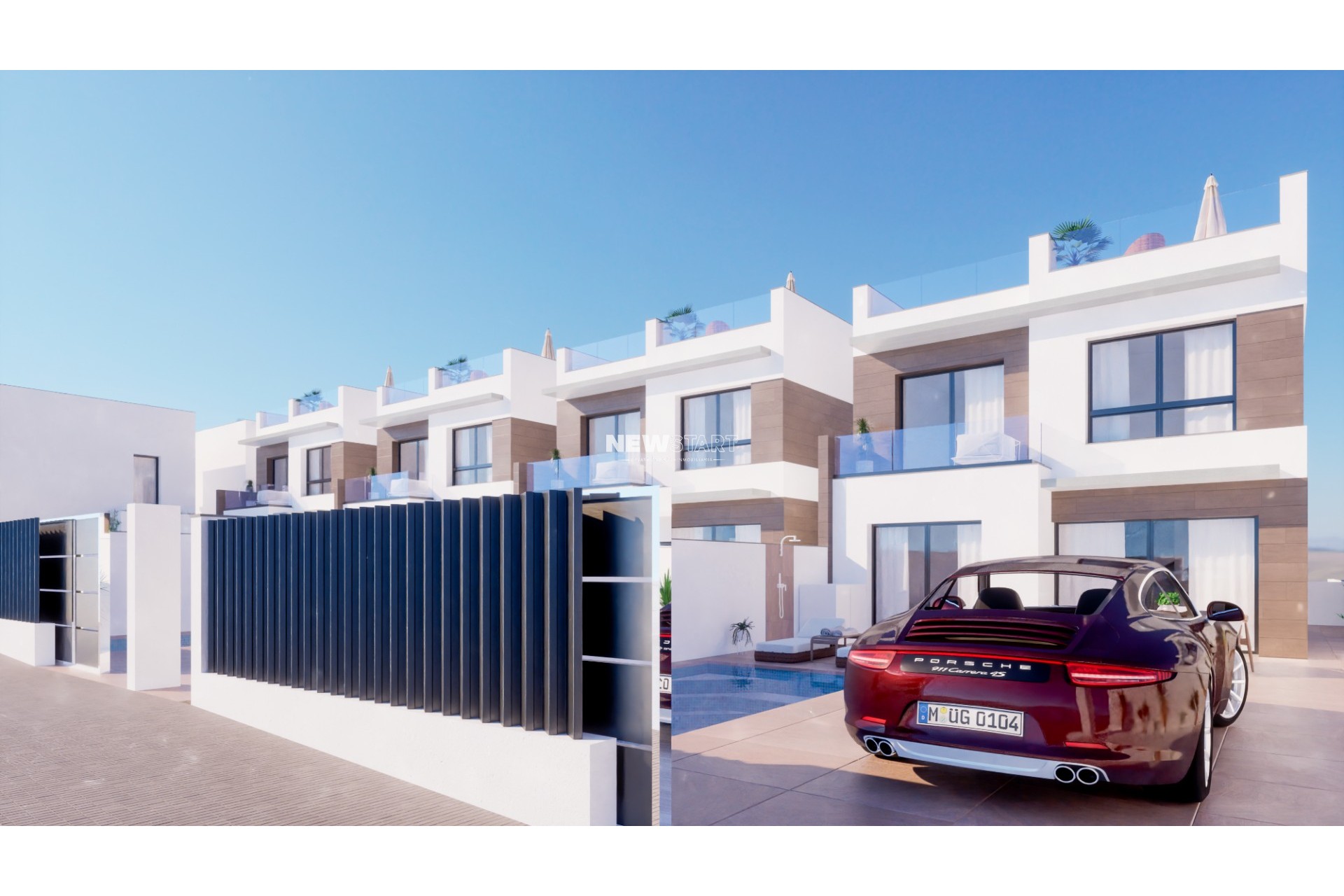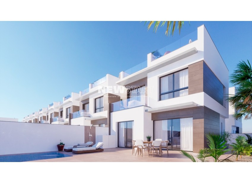 Newstart estates se enorgullece de ofrecer a la venta estas increíbles villas de nueva construcción en el pueblo de Benijofar en la Costa Blanca Sur. Villas de dos plantas con 3 dormitorios y 3 baños. La planta principal presenta un diseño abierto, combinando la cocina, comedor y salón en un gran espacio que se extiende a través de las grandes puertas correderas a la terraza y con vistas a la piscina privada. Además, en la planta baja hay un dormitorio principal con armarios empotrados y acceso al jardín y un cuarto de baño familiar, así como un lavadero junto a la cocina. Los 2 dormitorios restantes están en la primera planta, ambos con baño en-suite y uno con vestidor y su propia terraza privada. En el solarium se puede encontrar una ducha y una sección de césped artificial, así como pre-instalación para un jacuzzi.