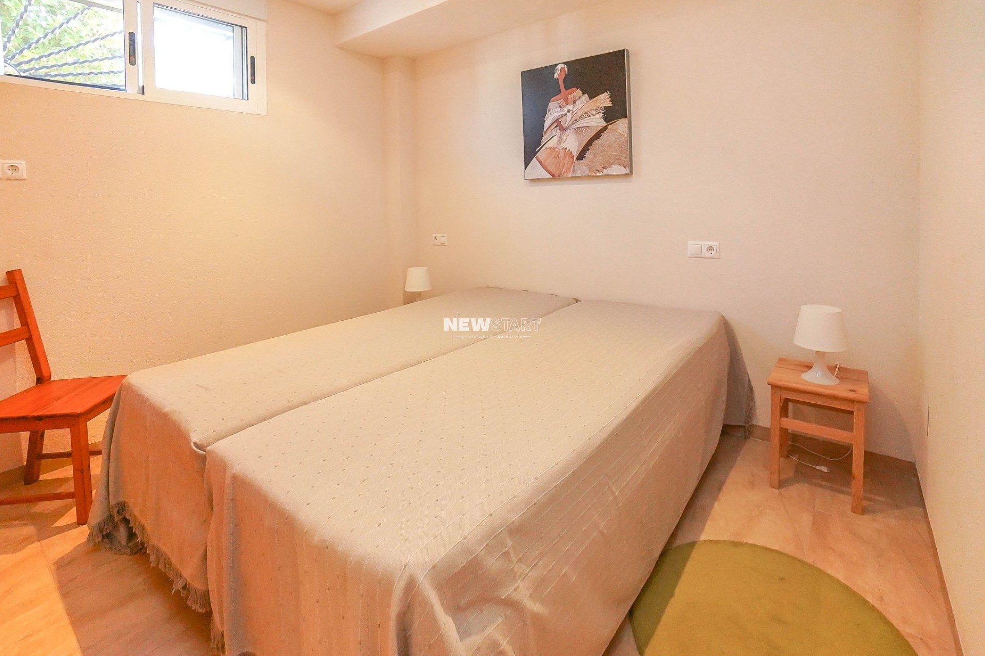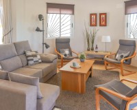Una escalera exterior conduce al piso inferior, donde encontramos un pasillo que conecta con más estancias, incluyendo 2 dormitorios espaciosos, también con armarios empotrados, un gran salón-comedor y un baño familiar con ducha. En el exterior, el jardín está mayormente alicatado e incluye una pequeña zona cubierta adornada con azulejos decorativos, con árboles maduros, palmeras y arbustos. El principal atractivo del jardín es la gran piscina privada, mantenida de forma impecable, de 8x4 con escalones romanos, completamente alicatada y rodeada de amplias zonas de asientos para relajarse y disfrutar del sol. La villa también dispone de una zona de comedor exterior, una ducha exterior y un doble acceso a la finca con aparcamiento privado seguro fuera de la carretera, que lleva a un gran garaje doble con un taller contiguo y más espacio de almacenamiento en la parte trasera.