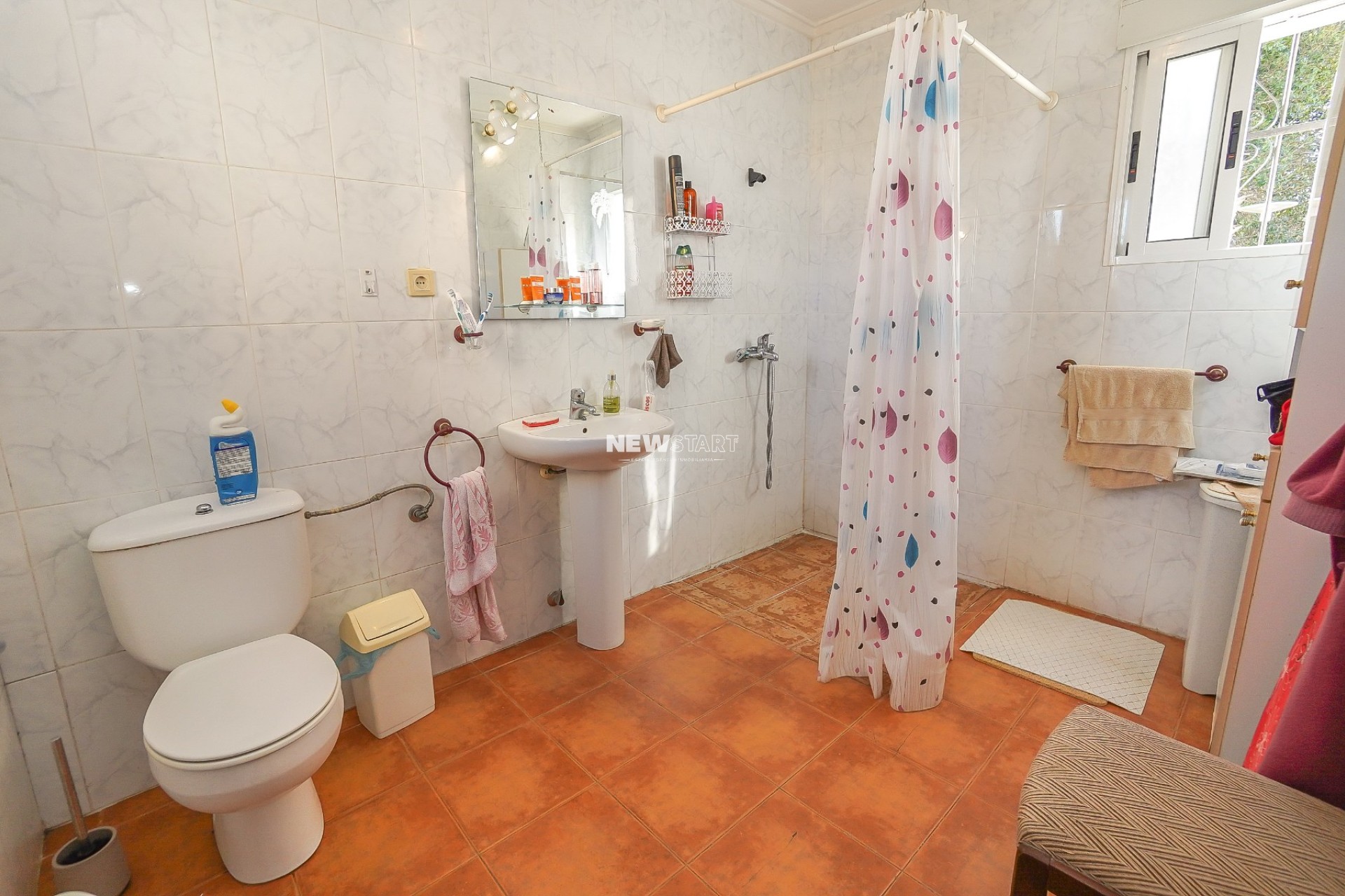 Il y a deux chambres, dont une chambre principale particulièrement spacieuse avec une salle de bains attenante agrandie, équipée d’une douche à l’italienne (wetroom) idéale pour les personnes à mobilité réduite. Il y a également une salle de bains familiale avec baignoire, lavabo et WC. À l’extérieur, la propriété offre de nombreux espaces pour profiter de la vie en plein air. L’entrée principale donne sur une grande terrasse semi-couverte avec une rampe d’accès, idéale pour les repas en extérieur, qui se prolonge par une terrasse ouverte équipée d’un store pour l’ombre pendant les mois les plus chauds.