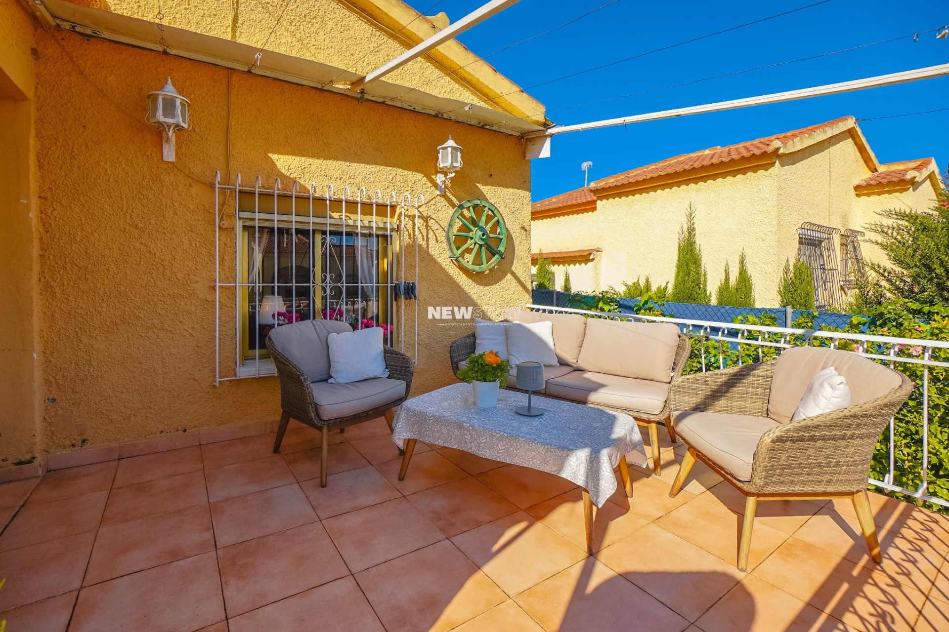 À l’extérieur, la villa bénéficie d’un terrain entièrement pavé et facile à entretenir, conçu pour la vie quotidienne et le divertissement. Un espace extérieur dédié pour s’asseoir et manger comprend un barbecue intégré et un store ajustable, créant l’endroit parfait pour des réunions avec la famille et les amis. Un accès privé avec portail mène à un espace vert protégé avec des arbres, des plantes et des arbustes matures, partagé avec les propriétés voisines, offrant une vue naturelle paisible. Parmi les autres caractéristiques, citons un espace de rangement et plusieurs coins salon répartis sur la parcelle.