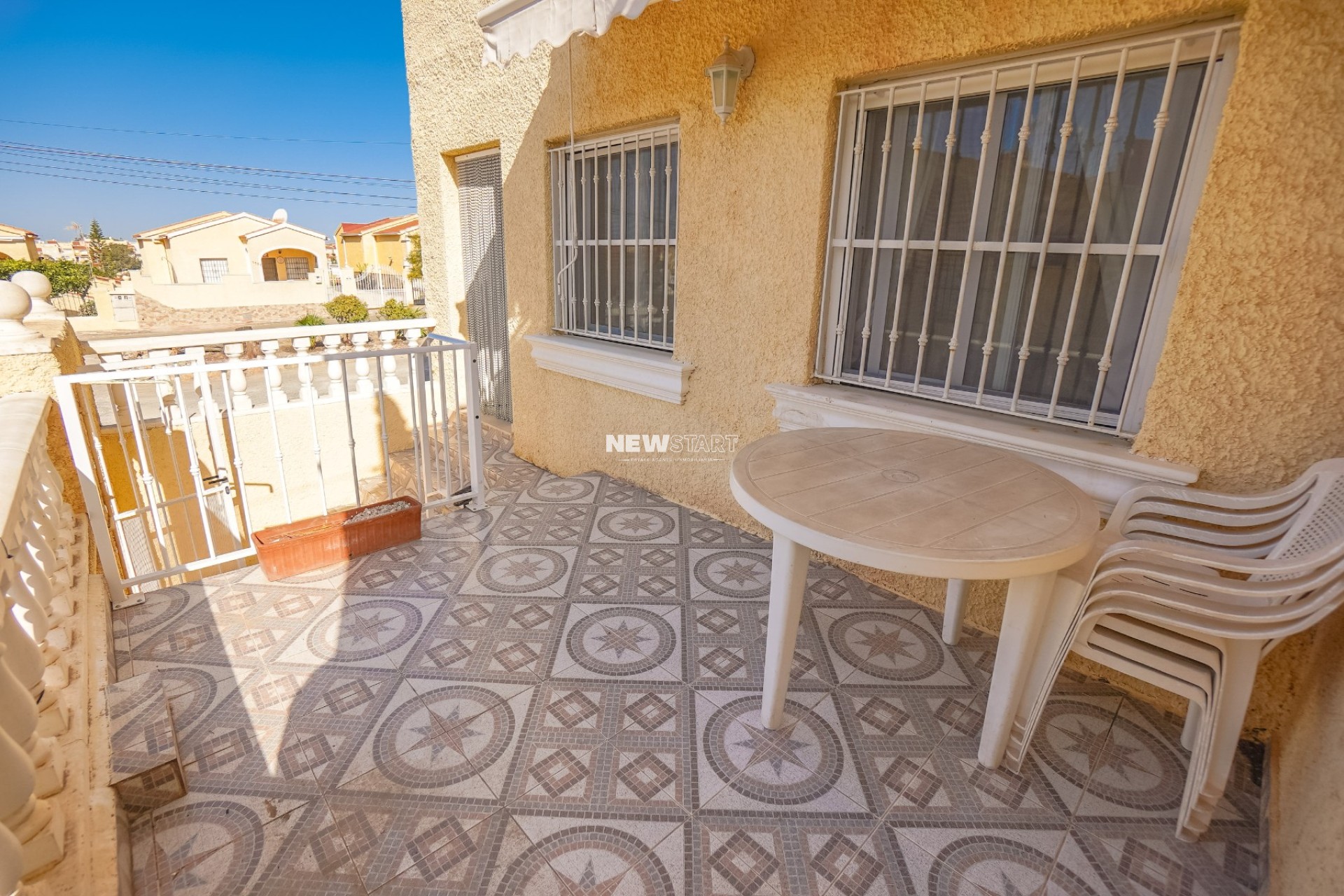 De woning maakt deel uit van een goed onderhouden gemeenschap die beschikt over een gemeenschappelijk zwembad, beschikbaar voor bewoners tegen een kleine jaarlijkse bijdrage. Bij binnenkomst van de woning wordt u verwelkomd door een volledig betegeld verhoogd terras, perfect voor een onderhoudsvriendelijke levensstijl buiten. Deze ruimte is ideaal voor buiten dineren of gewoon ontspannen in de zon, met het extra voordeel van een uitschuifbaar zonnescherm. Een versterkte voordeur leidt naar een lichte en comfortabele woonkamer en eetkamer met een open, volledig uitgeruste keuken. Op de begane grond is er ook een familiebadkamer met een hoekdouche, wastafel en toilet.