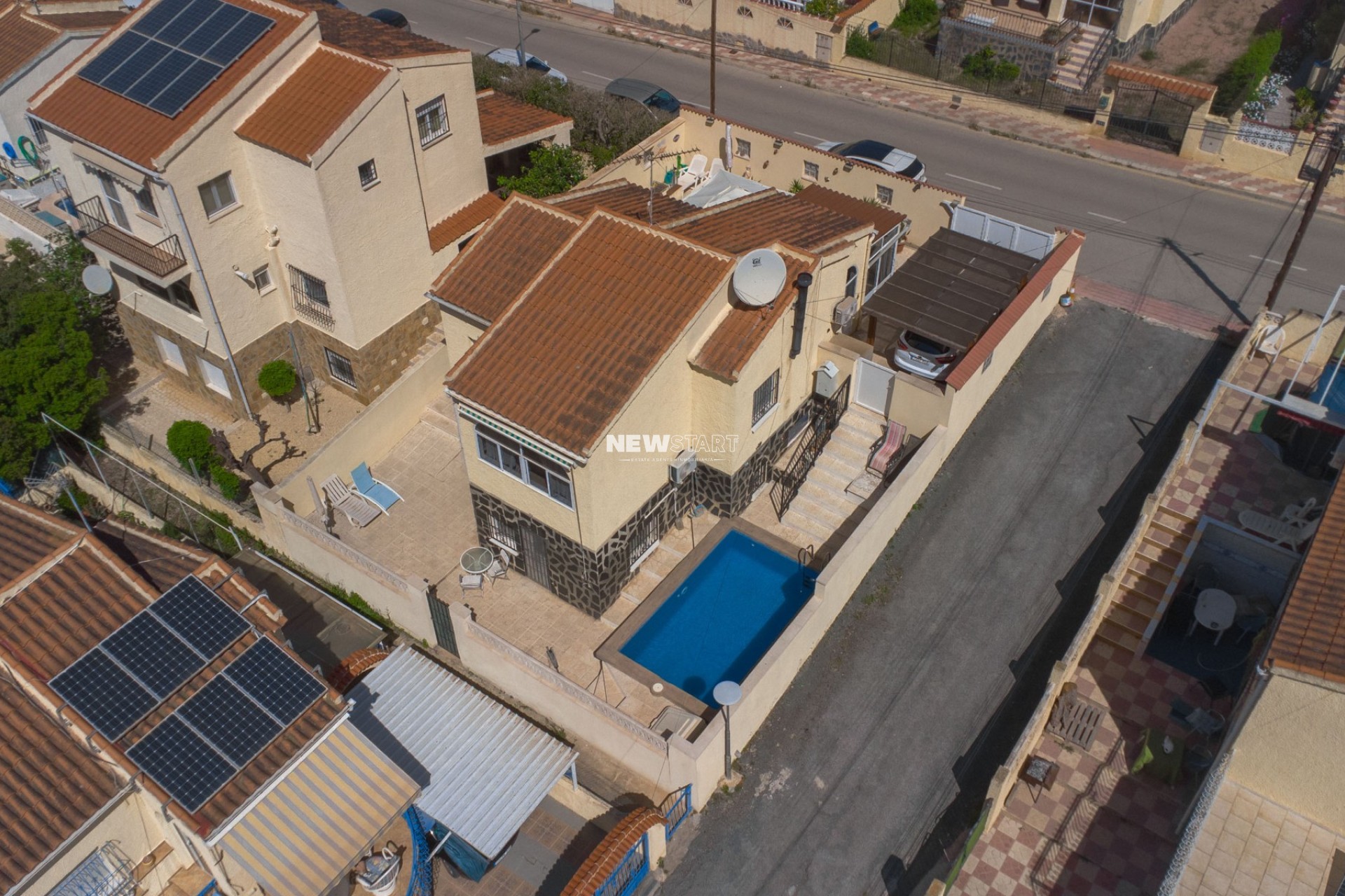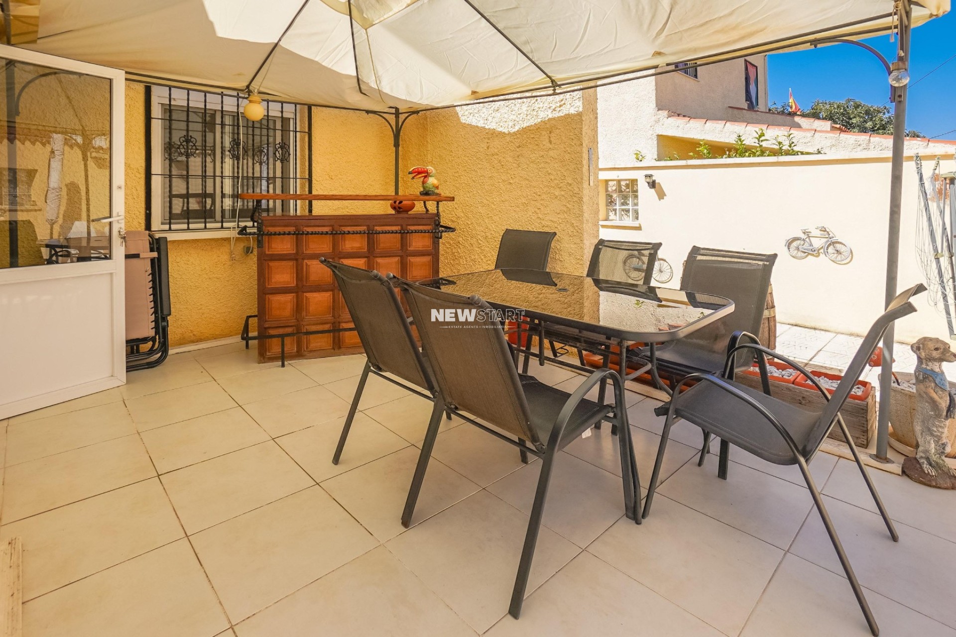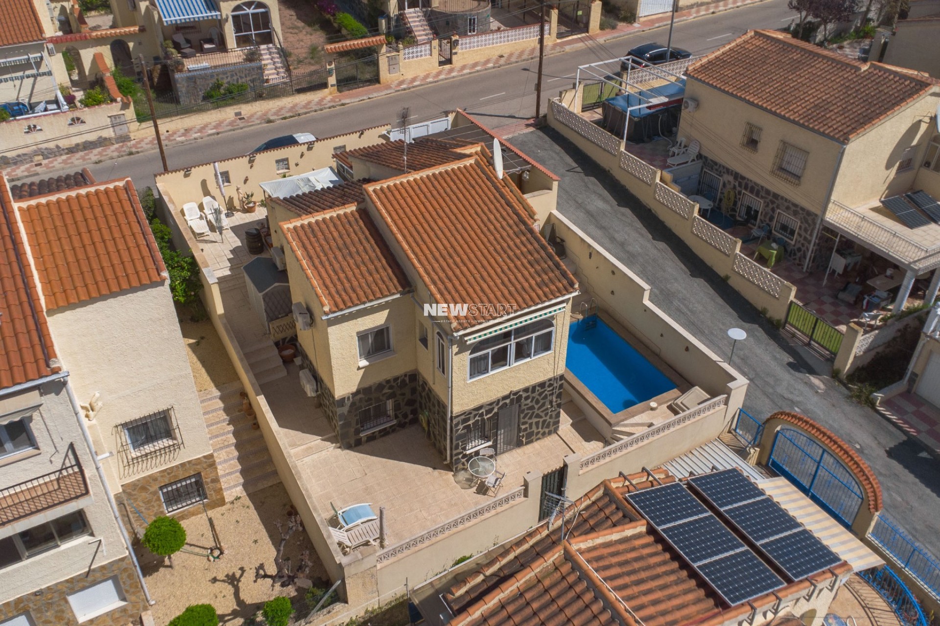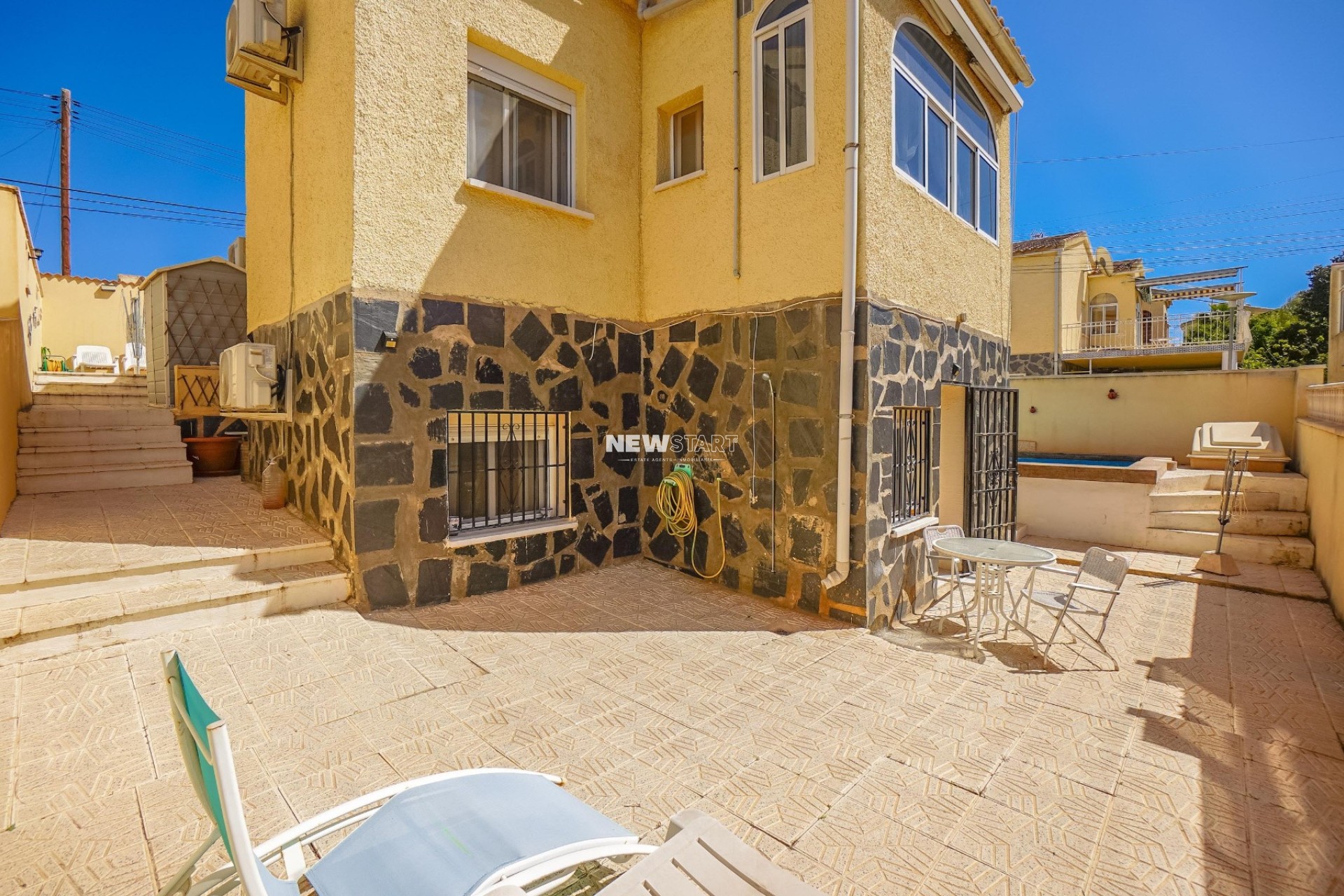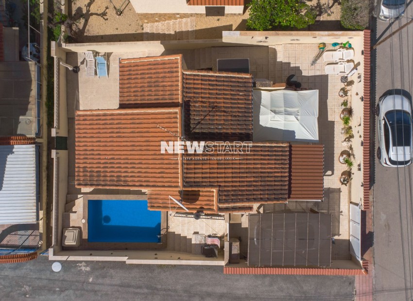 Op de begane grond, met een woonoppervlak van 69m², leidt de entree naar een ruime en uitgebreide serre, die momenteel is ingericht als eetkamer. Vanuit hier komt u in een lichte en uitnodigende woonkamer met een sfeervolle houtgestookte open haard, waardoor er een gezellige en huiselijke sfeer ontstaat. Deze verdieping beschikt over twee tweepersoonsslaapkamers met inbouwkasten, en een moderne badkamer met inloopdouche, toilet en wastafelmeubel. Daarnaast is er een aparte, nieuw ingerichte keuken met granieten werkbladen en apparatuur, die toegang biedt tot een praktische bijkeuken aan de achterzijde. De tuin is volledig betegeld voor eenvoudig onderhoud en is verdeeld over twee niveaus, met voldoende ruimte om buiten te ontspannen en te genieten van het Spaanse klimaat. Enkele treden leiden naar het lagere gedeelte van de tuin, waar het hoogtepunt de prachtig onderhouden privézwembad van 15m² is - perfect om af te koelen of gasten te ontvangen.