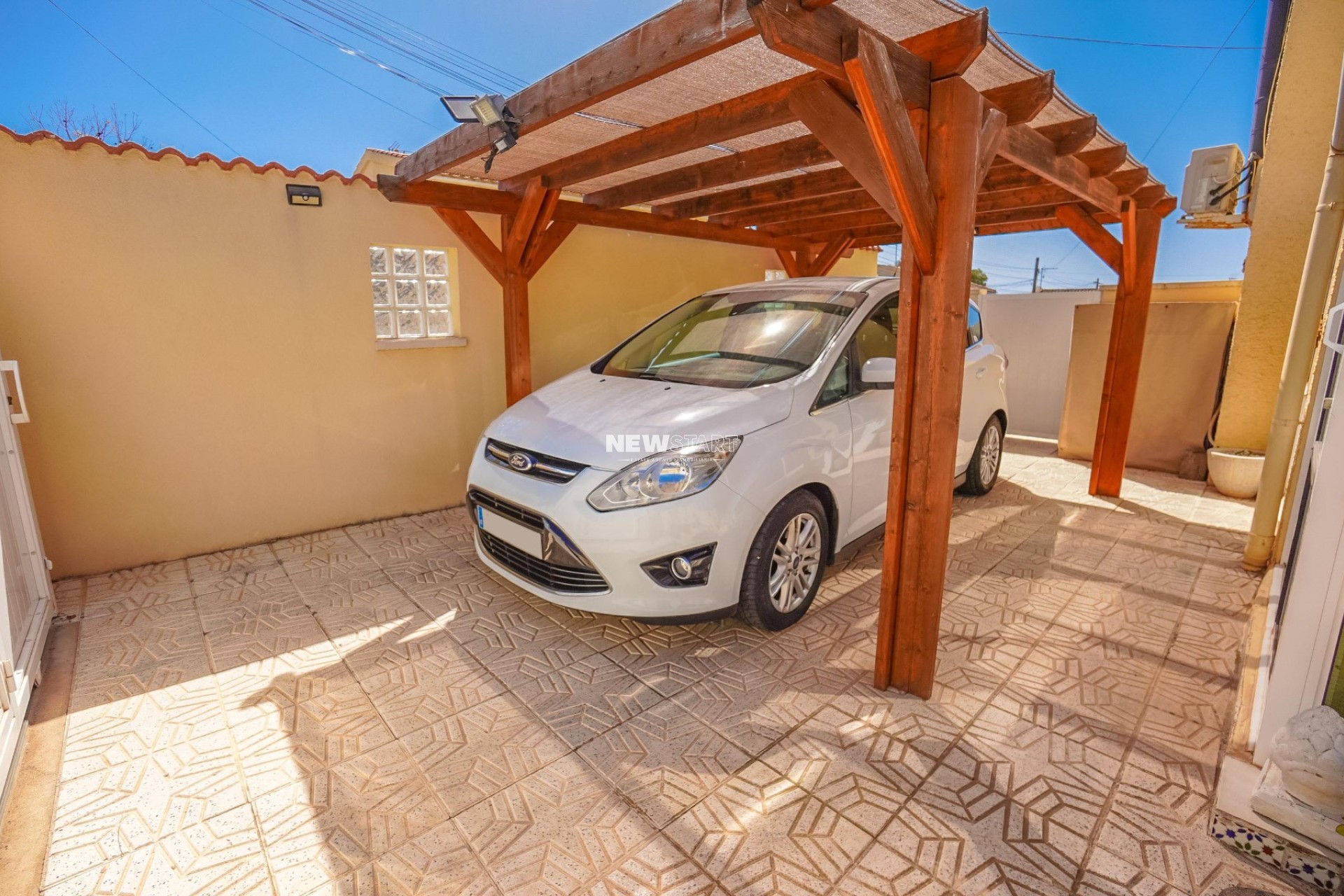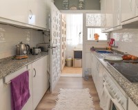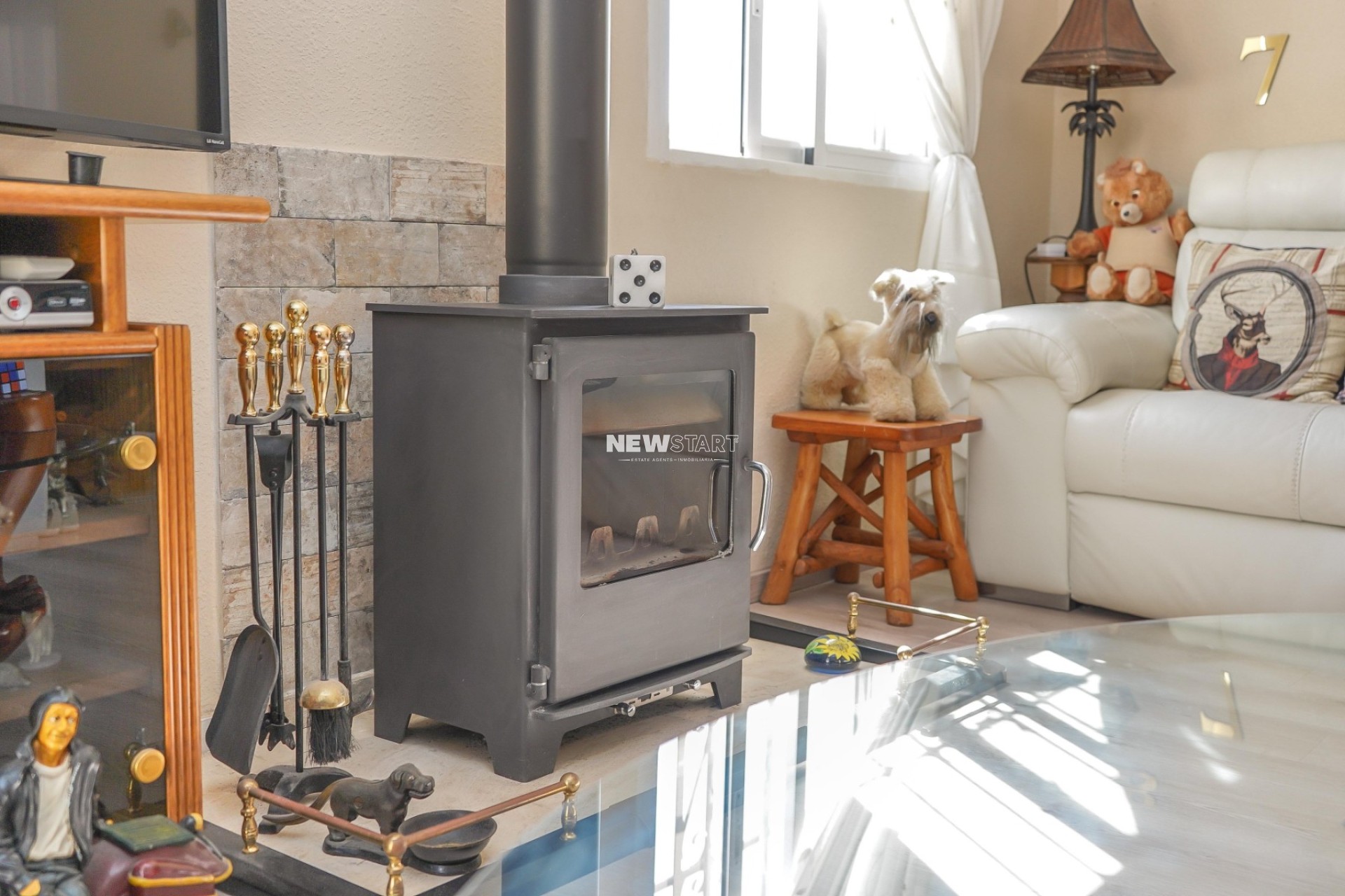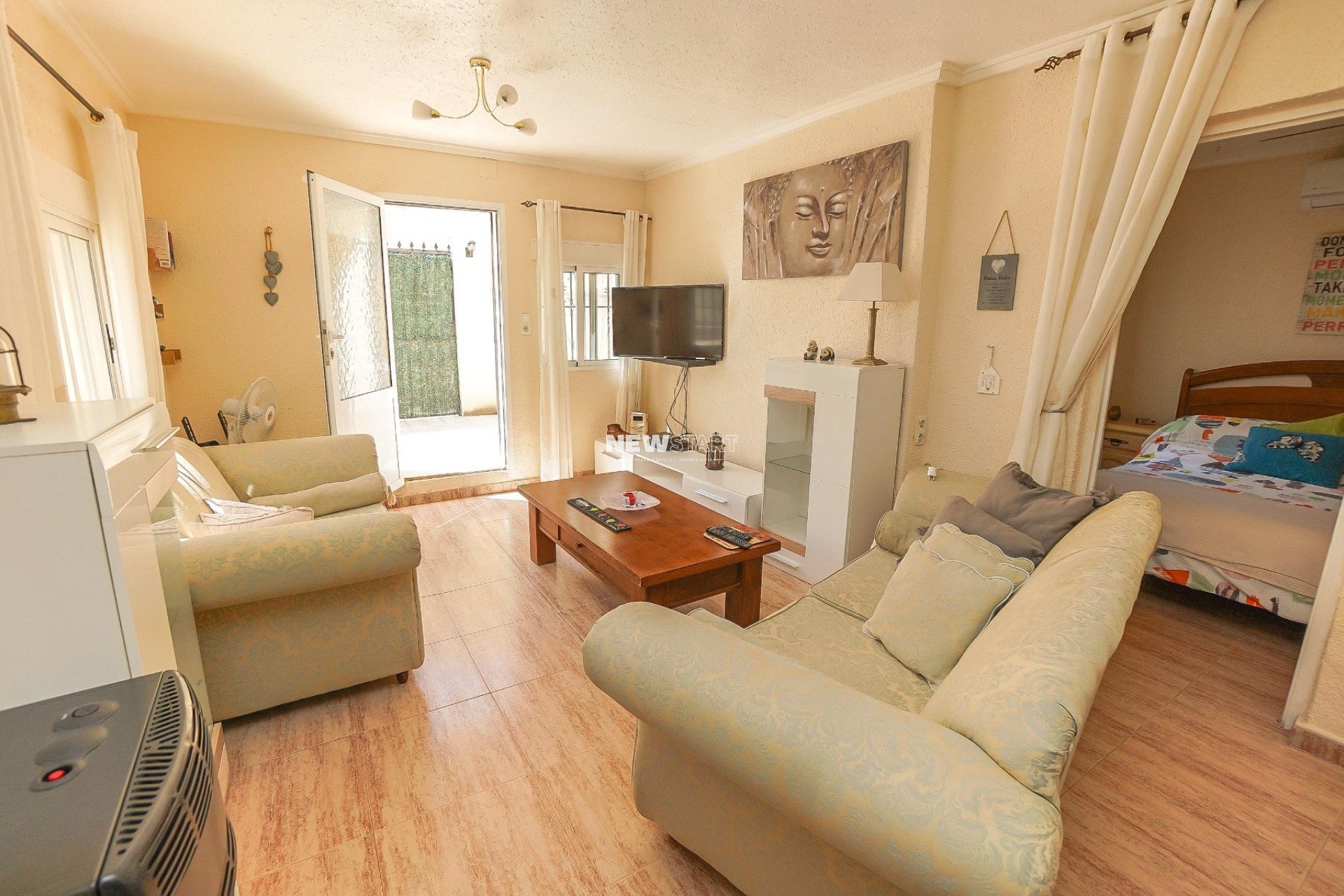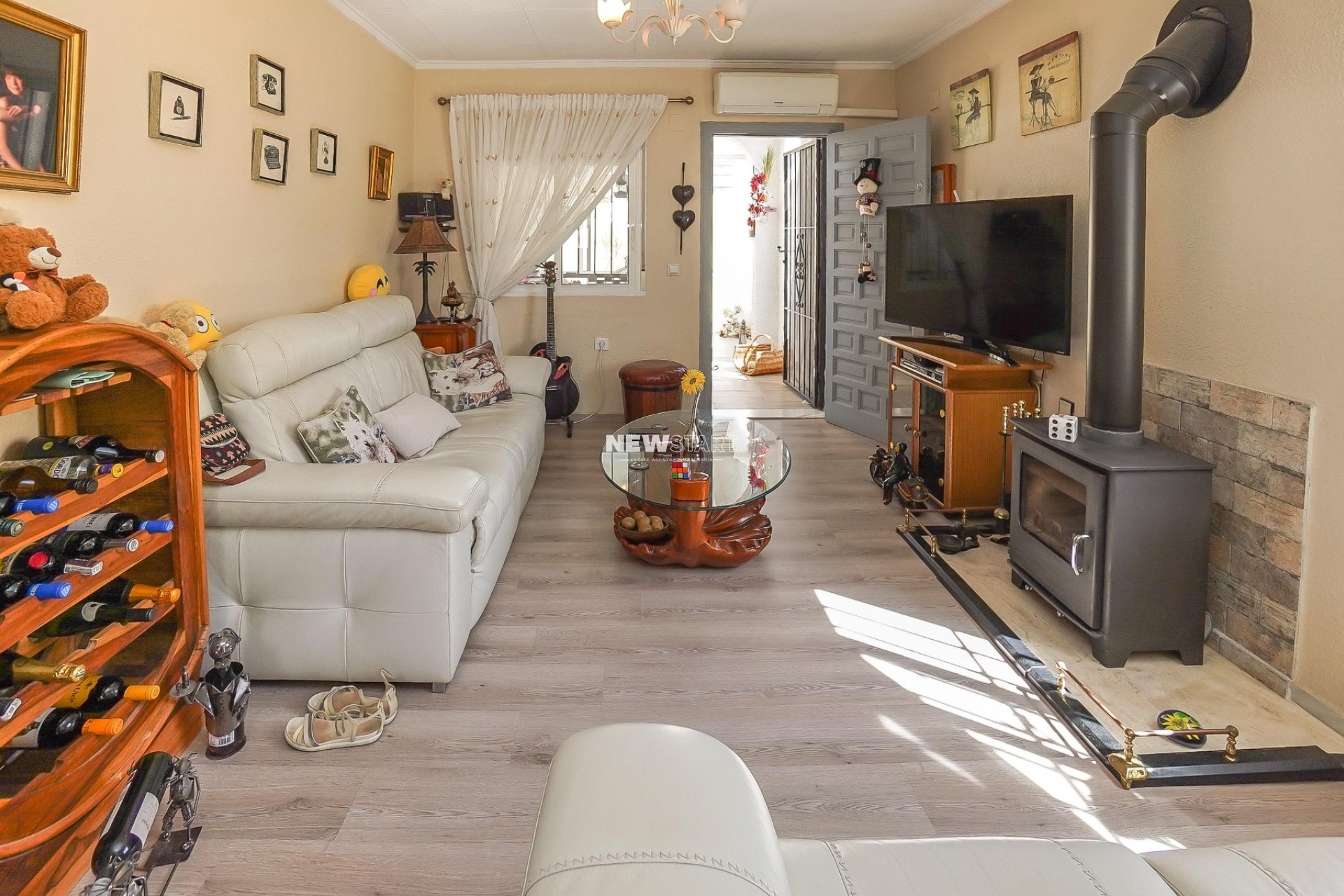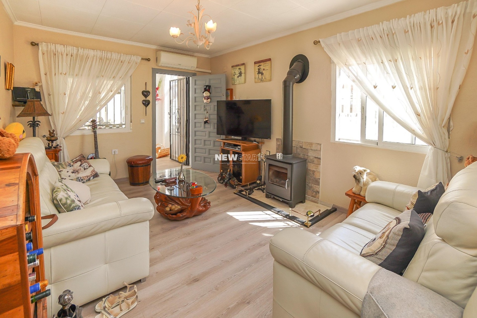 Op de begane grond, met een woonoppervlak van 69m², leidt de entree naar een ruime en uitgebreide serre, die momenteel is ingericht als eetkamer. Vanuit hier komt u in een lichte en uitnodigende woonkamer met een sfeervolle houtgestookte open haard, waardoor er een gezellige en huiselijke sfeer ontstaat. Deze verdieping beschikt over twee tweepersoonsslaapkamers met inbouwkasten, en een moderne badkamer met inloopdouche, toilet en wastafelmeubel. Daarnaast is er een aparte, nieuw ingerichte keuken met granieten werkbladen en apparatuur, die toegang biedt tot een praktische bijkeuken aan de achterzijde. De tuin is volledig betegeld voor eenvoudig onderhoud en is verdeeld over twee niveaus, met voldoende ruimte om buiten te ontspannen en te genieten van het Spaanse klimaat. Enkele treden leiden naar het lagere gedeelte van de tuin, waar het hoogtepunt de prachtig onderhouden privézwembad van 15m² is - perfect om af te koelen of gasten te ontvangen.