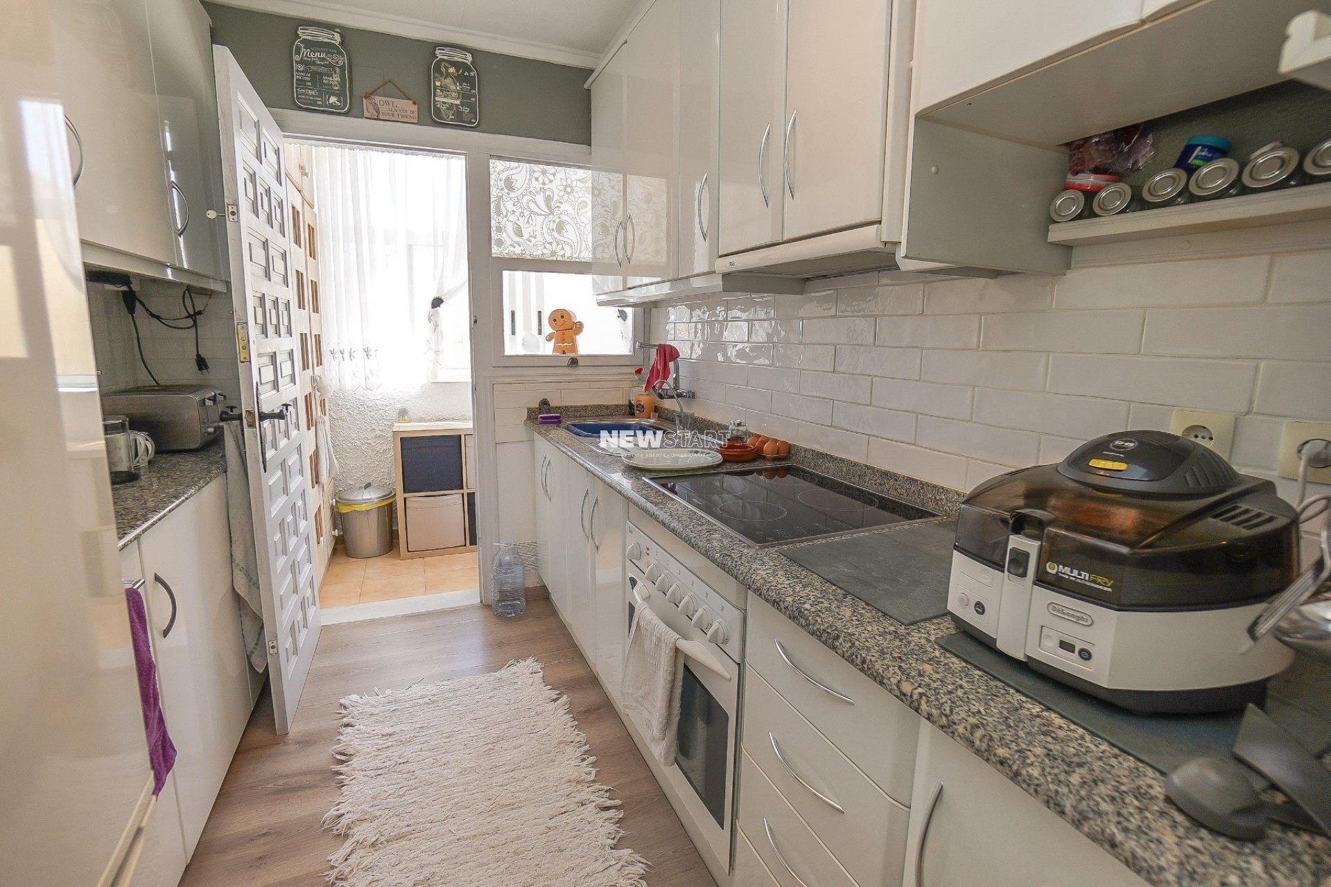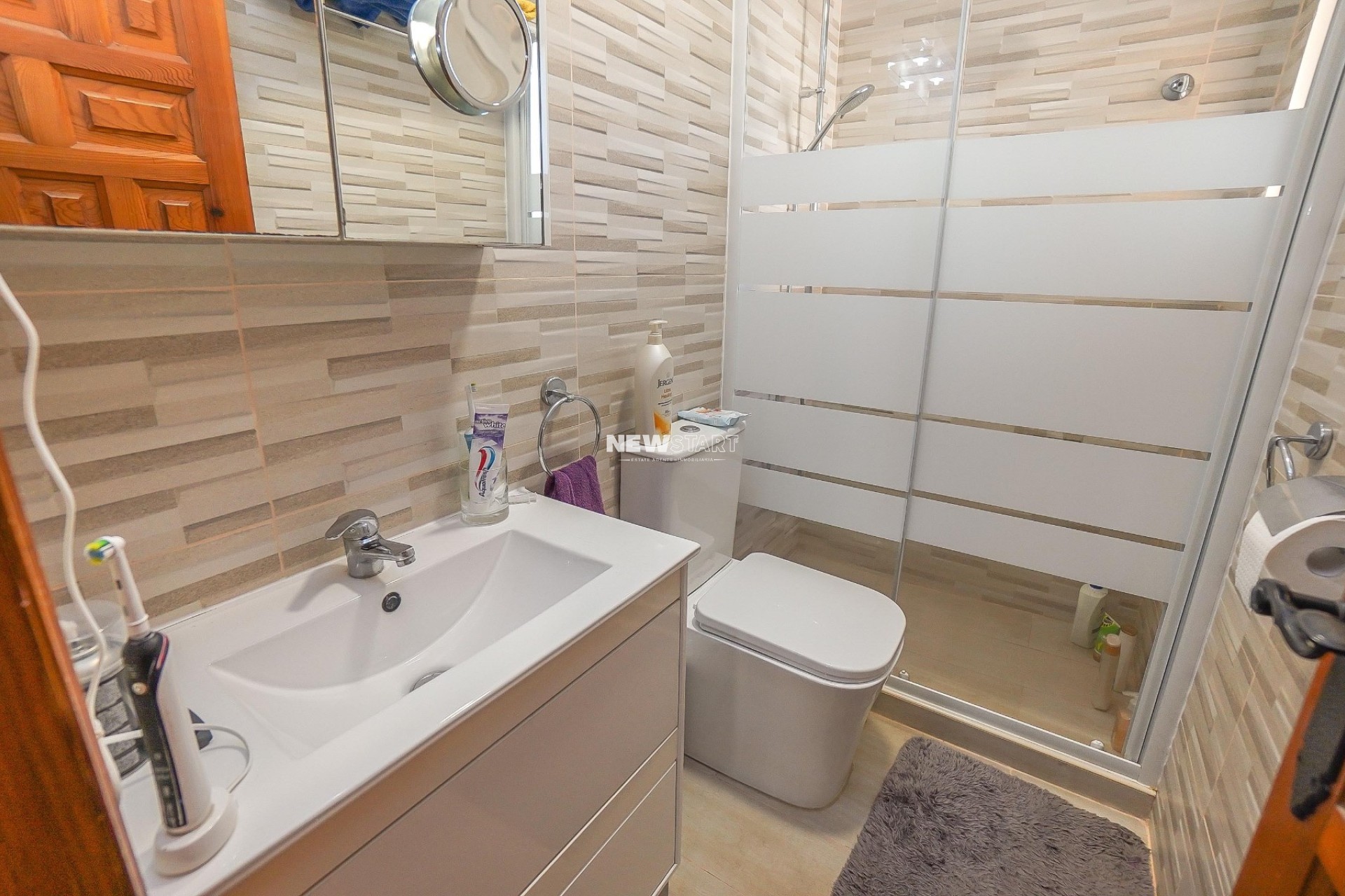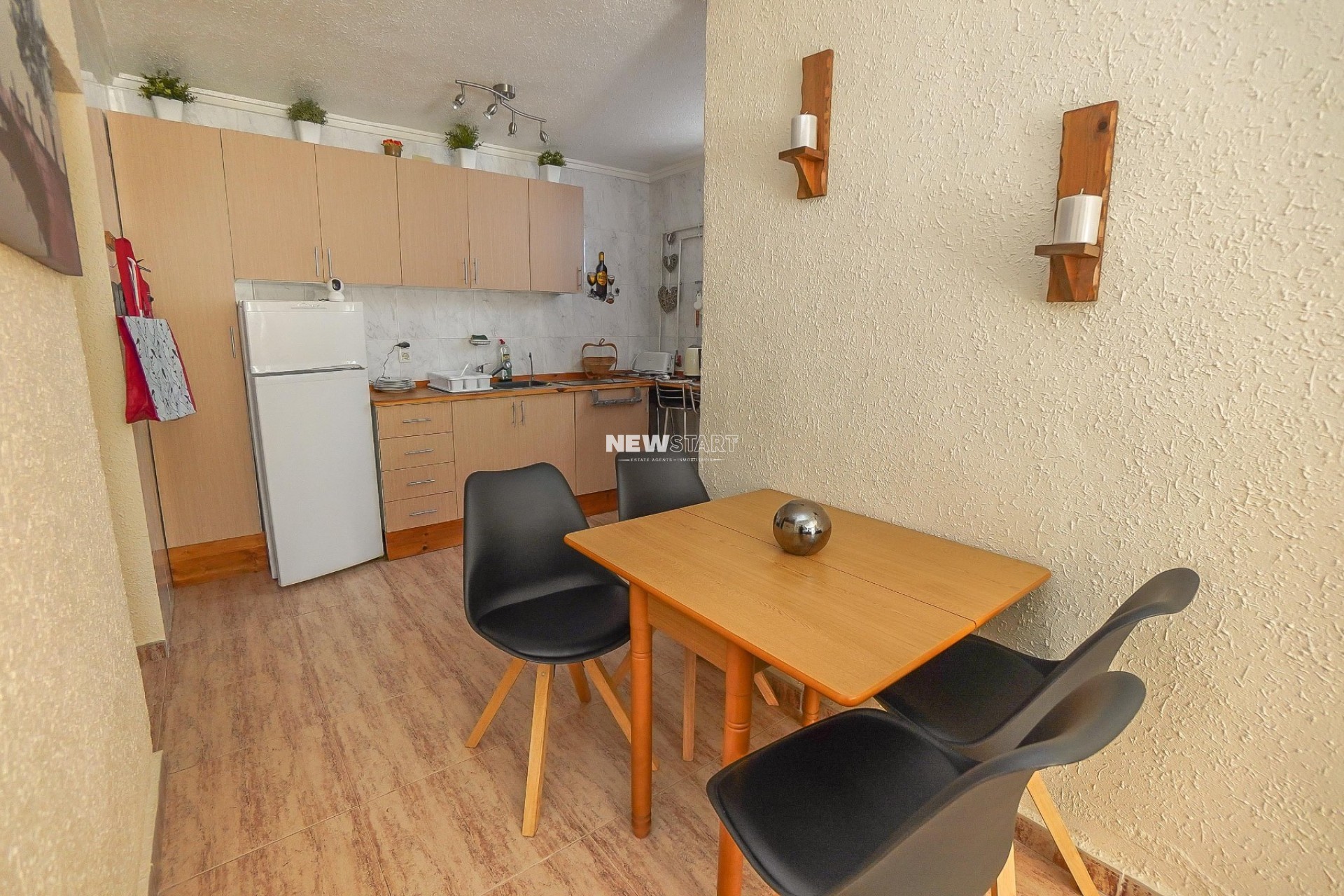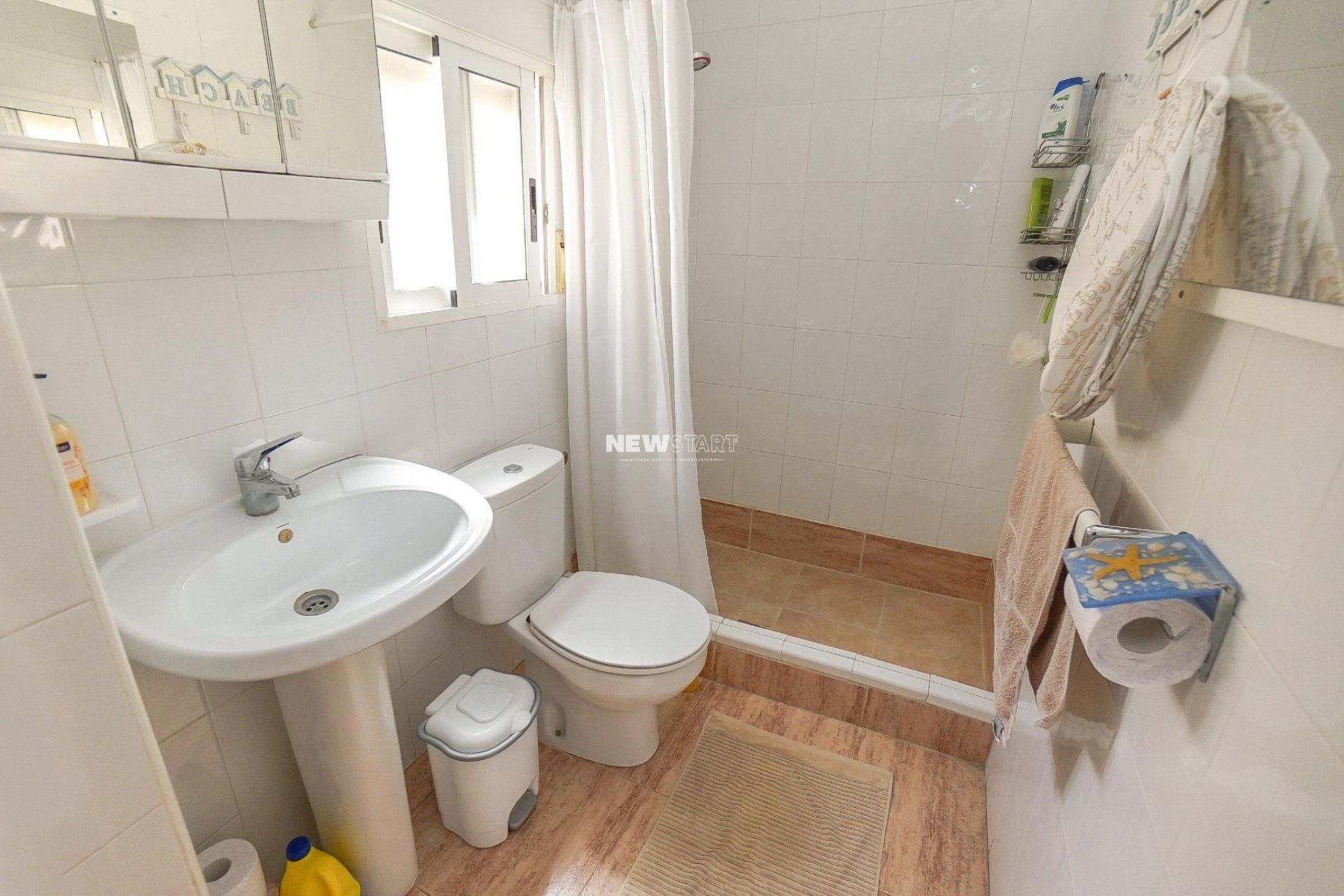 Op de begane grond, met een woonoppervlak van 69m², leidt de entree naar een ruime en uitgebreide serre, die momenteel is ingericht als eetkamer. Vanuit hier komt u in een lichte en uitnodigende woonkamer met een sfeervolle houtgestookte open haard, waardoor er een gezellige en huiselijke sfeer ontstaat. Deze verdieping beschikt over twee tweepersoonsslaapkamers met inbouwkasten, en een moderne badkamer met inloopdouche, toilet en wastafelmeubel. Daarnaast is er een aparte, nieuw ingerichte keuken met granieten werkbladen en apparatuur, die toegang biedt tot een praktische bijkeuken aan de achterzijde. De tuin is volledig betegeld voor eenvoudig onderhoud en is verdeeld over twee niveaus, met voldoende ruimte om buiten te ontspannen en te genieten van het Spaanse klimaat. Enkele treden leiden naar het lagere gedeelte van de tuin, waar het hoogtepunt de prachtig onderhouden privézwembad van 15m² is - perfect om af te koelen of gasten te ontvangen.