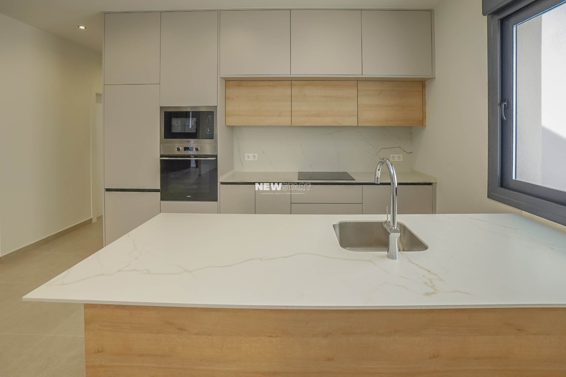 De begane grond verwelkomt u met een lichte en ruime woon- en eetkamer, verrijkt door grote ramen van vloer tot plafond die zorgen voor veel natuurlijk licht. Een strakke open keuken met een elegante peninsula met zitplaatsen en Silestone-werkbladen sluit perfect aan bij de moderne indeling, met daarachter een aparte bijkeuken. Vanuit de woonkamer geven grote schuifdeuren toegang tot de volledig betegelde tuin met een privézwembad. Op deze verdieping bevindt zich tevens een comfortabele tweepersoonsslaapkamer met ingebouwde kasten en een moderne familiebadkamer met een inloopdouche over de volledige breedte, een hangtoilet en een zwevend badmeubel met wastafel.