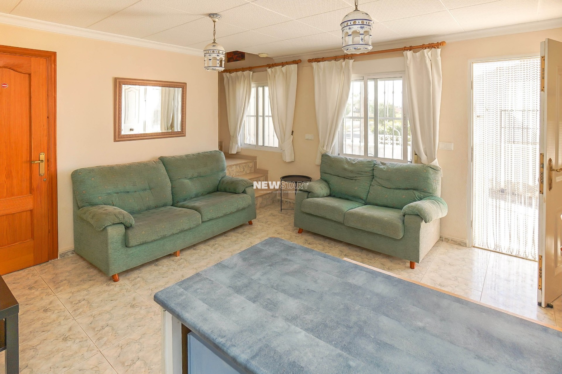 Situated in a prime location within the popular Urb. La Marina, this extended 2 bedroom, 2 bathroom Townhouse Josefina offers spacious and versatile living spread over three levels, complete with a basement and a rooftop solarium. The property has a build size of approximately 96m² and enjoys a desirable south-facing corner position in a quiet Parque area, just a short 2-minute walk from a wide range of local amenities including bars, restaurants, shops, and a little further a second commercial area with a supermarket and additional services. The property is part of a well-maintained community that benefits from a communal swimming pool, available for residents to enjoy with a small annual fee. Upon entering the property, you are welcomed by a fully tiled raised front terrace, perfect for low-maintenance outdoor living. This space is ideal for alfresco dining or simply relaxing under the sun, with the added benefit of a retractable sun awning. A reinforced front door leads into a bright and comfortable lounge and dining area with an open-plan fitted kitchen. On the ground floor, there is also a family bathroom with a corner shower, washbasin, and toilet.