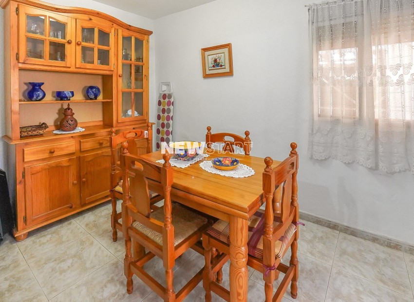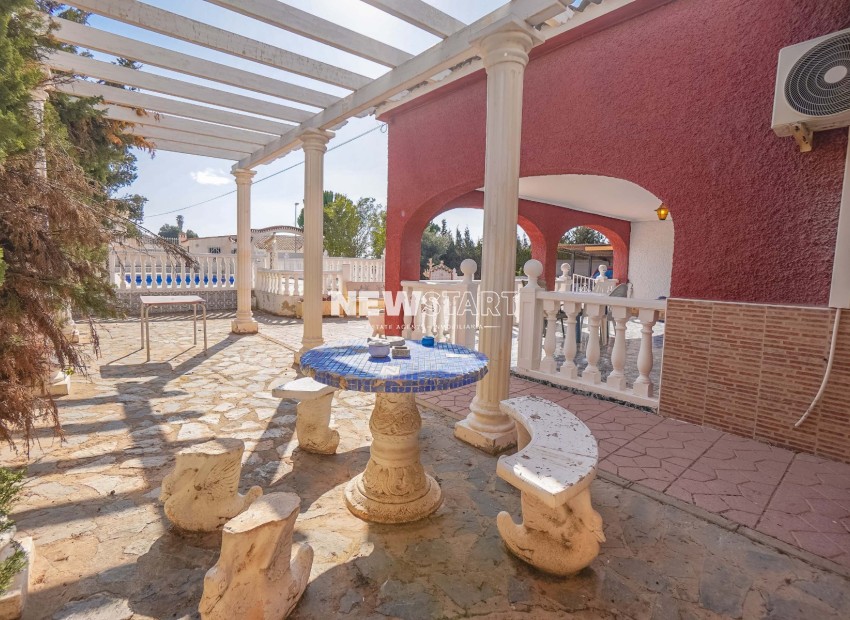 A Traditional style, south-facing Spanish Finca with 4 bedrooms, and 2 bathrooms, located in a peaceful area of La Escuera, La Marina Urb. This spacious detached home sits on a generous, flat 839 M2 plot and offers 137 M2 of living space, all conveniently set on one level for comfortable living. The main house welcomes you with a charming, very large covered terrace perfect for al fresco dining and relaxation. Inside, youll find a spacious hall which leads to a separate lounge with a feature fireplace. There is a separate dining room, from which you can access a fully fitted kitchen. Additionally, there is a well-appointed large family-size wetroom, with a sink, a toilet and an open shower. The property boasts four good-sized furnished bedrooms, all with free-standing wardrobes. The master bedroom also features an en-suite bathroom with a walk-in shower and cubicle.