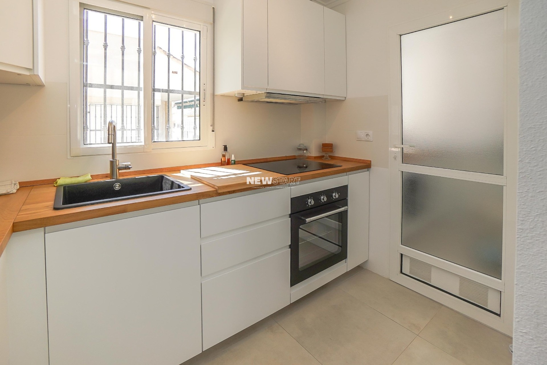 Boendet är fördelat på två rymliga våningar. På bottenvåningen leder ett enda steg upp till en solig terrass med matplats utomhus och en markis för skugga. Härifrån kommer man in i ett modernt möblerat vardagsrum med gott om utrymme, pelletskamin och separat matplats. Det finns ett nyinstallerat separat kök med moderna ytor i kvarts och kvalitetsapparater. På samma plan finns två väl tilltagna sovrum med inbyggda garderober och ett nytt familjebadrum med handfat, toalett och en dusch med glasvägg från vägg till vägg.
