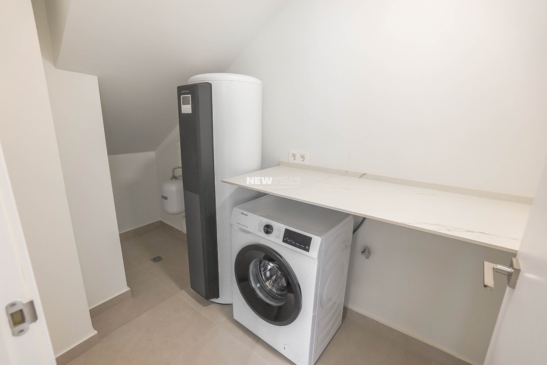 På bottenvåningen möts du av ett ljust och rymligt vardagsrum med matplats, förstärkt av fönster från golv till tak som fyller hemmet med naturligt ljus. Ett stilrent kök i öppen planlösning med en elegant köksö med sittplatser och bänkskivor i Silestone kompletterar den moderna designen, tillsammans med en separat tvättstuga bakom köket. Från vardagsrummet leder stora skjutdörrar ut till en helkaklad trädgård med privat pool. På denna våning finns även ett bekvämt dubbelrum med inbyggda garderober samt ett modernt badrum med dusch från vägg till vägg, vägghängd toalett och vägghängt handfat.